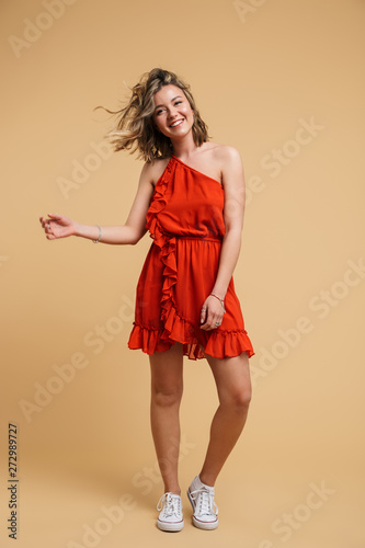 Full length photo of young blonde woman 20s wearing red dress smiling and poising at camera