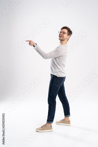Full length portrait of a cheerful young man wearing casual clothes isolated over white background, pointing away at copy space.