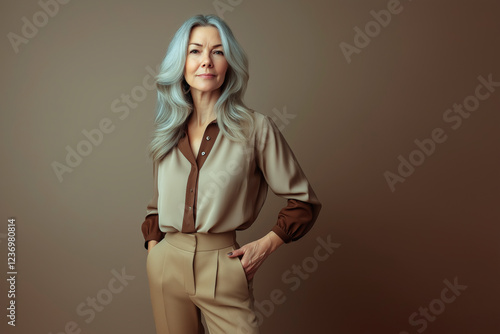 Full length portrait of a woman in her 50s looking into the camera wearing a brown blouse and beige trousers in a casual style, standing against a solid light brown background.