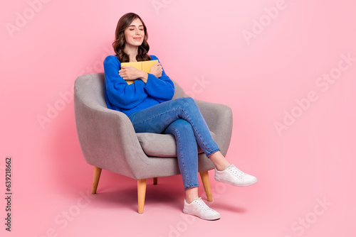 Full length portrait of adorable peaceful person sit soft chair hug book closed eyes empty space isolated on pink color background