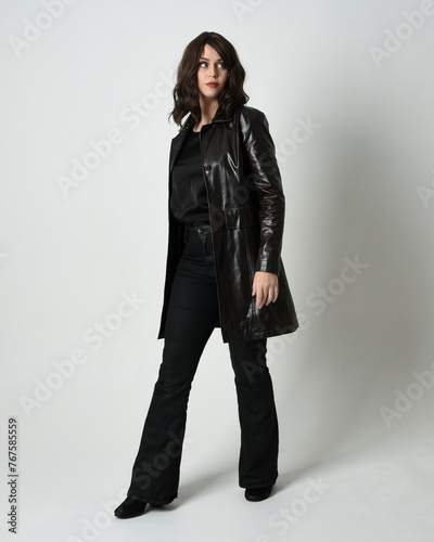 Full length portrait of beautiful brunette woman wearing long black leather trench coat, film noir detective. Standing pose, walking towards the camera, reaching out. Isolated white studio background