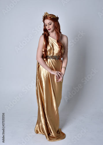 Full length portrait of girl with red hair wearing long grecian toga and golden wreath. Standing pose iisolated against a grey studio background.