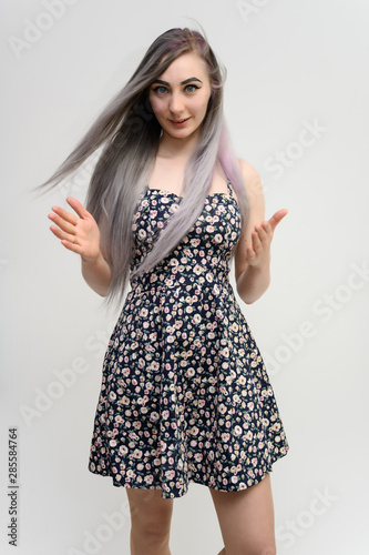 Full length studio portrait of a pretty student girl with long beautiful hair in a beautiful color dress on a white background. He stands straight, smiles, shows with his hands.