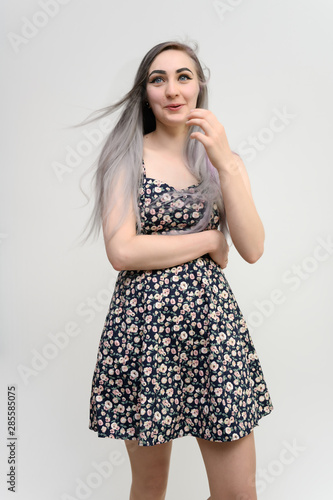 Full length studio portrait of a pretty student girl with long beautiful hair in a beautiful color dress on a white background. He stands straight, smiles, shows with his hands.