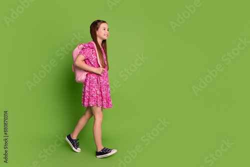 Full size photo of cute schoolgirl backpack walk empty space wear pink dress isolated on green color background