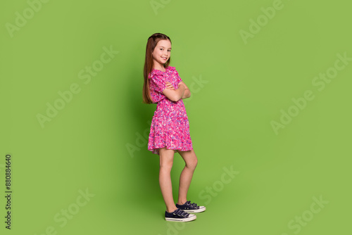 Full size photo of cute schoolgirl crossed arms empty space wear pink dress isolated on green color background