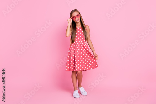 Full size photo of satisfied positive pupil hand touch glasses toothy smile isolated on pink color background