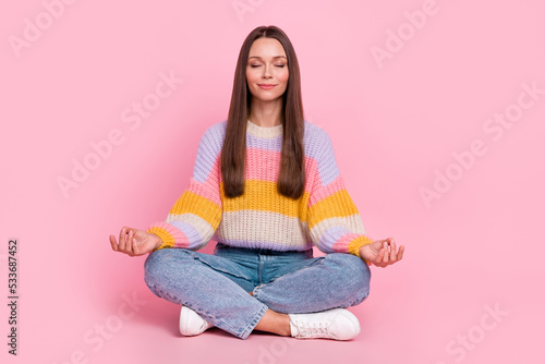 Full size portrait of pretty positive girl sit floor closed eyes crossed legs meditate isolated on pink color background