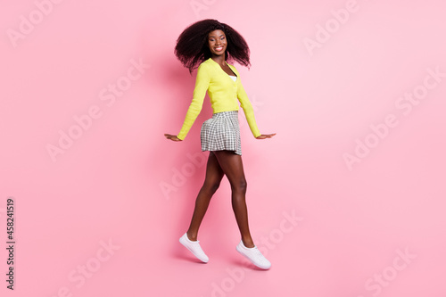 Full size profile side photo of young beautiful lovely cheerful positive afro girl go walk in air isolated on pink color background