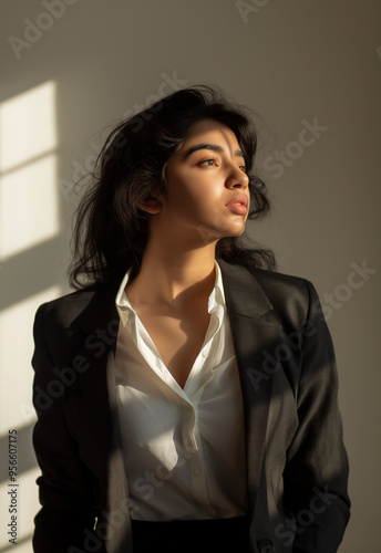 Full-body portrait of a young Indian businesswoman in grey academia style, exuding confidence and precision as a corporate senior executive