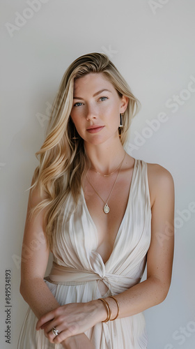 full-body shot of a stunning blonde woman standing against a pristine white background. She is wearing a beautiful, high-slit dress that elegantly drapes around her figure, showcasing her style and co
