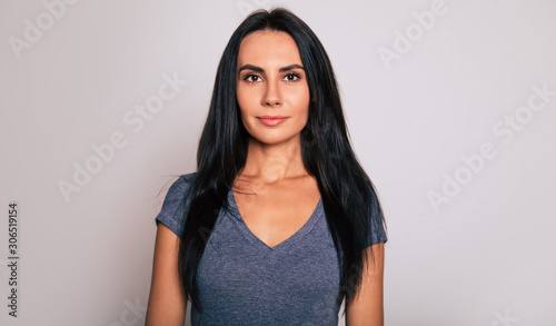Full-face portrait of a young attractive woman with long jet-black hair, who is standing in front and looking in the camera with a serious face expression.
