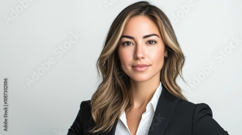 Full-length bust portrait of a lawyer, wearing a sharp suit and tie, looking confident and approachable, with light make-up, white background