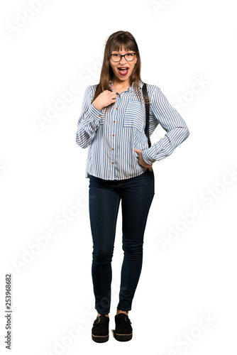 Full-length shot of Woman with glasses surprised and shocked while looking right