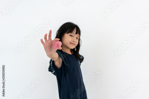 Funny Asian girl playing with pink slime. childhood, leisure concept