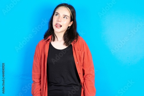 Funny Beautiful woman wearing red jacket makes grimace and crosses eyes plays fool has fun alone sticks out tongue.