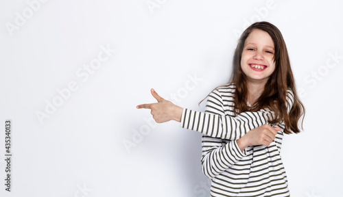 Funny dark-haired girl shows class gesture with her hands. On a light background. Space for text.