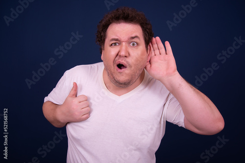 Funny fat man is watching a scary movie.