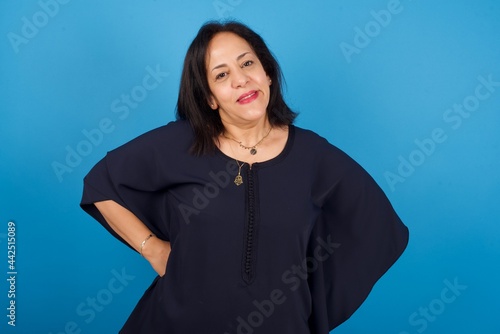 Funny frustrated middle aged Arab woman standing against blue background holding hands on waist and silly looking at awkward situation.