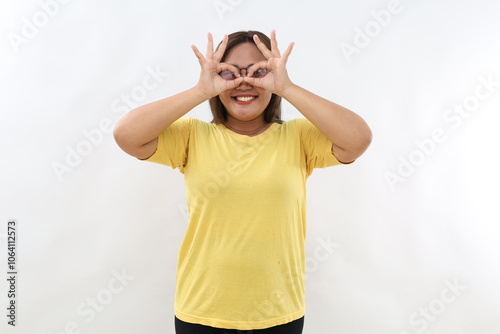 Funny playful Asian woman covers eyes with ok signs, makes binoculars gesture. Isolated on white