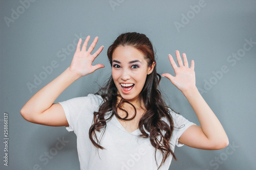 Funny portrait of happy asian young woman with dark long hair in white t-shirt on grey background