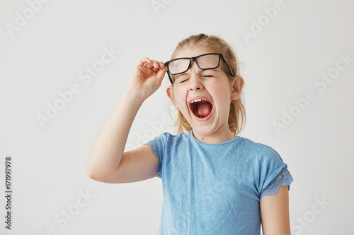 Funny small blonde girl with pretty blue eyes raising glasses and yawning with closed eyes in classroom because long boring lesson.