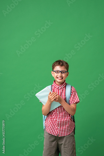 Funny smart Caucasian boy 7 years old with glasses with a school bag and a book.