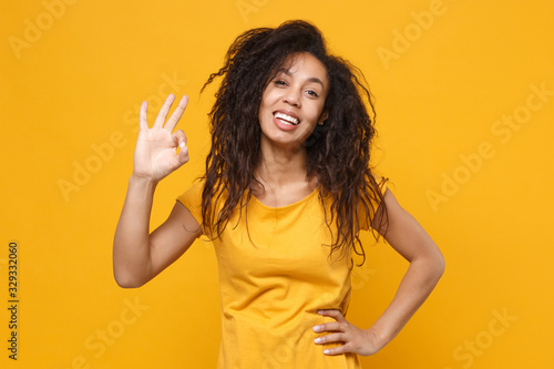 Funny young african american woman girl in casual t-shirt posing isolated on yellow orange background studio portrait. People sincere emotion lifestyle concept. Mock up copy space. Showing OK gesture.