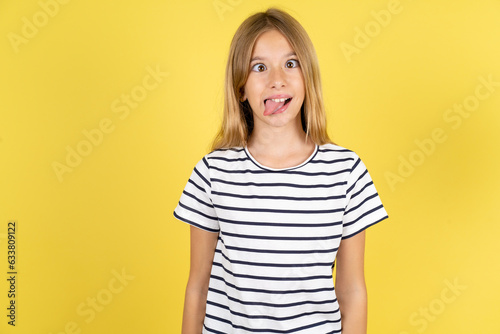 Funny young beautiful blonde kid girl over yellow studio background makes grimace and crosses eyes plays fool has fun alone sticks out tongue.