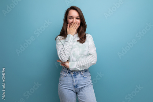 funny young brunette lady dressed in a striped shirt and jeans on a studio background