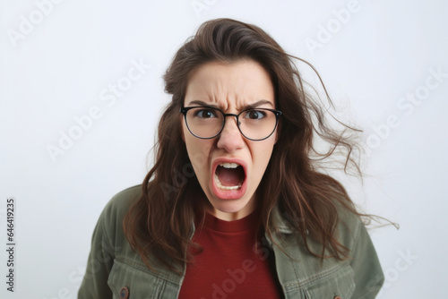 Furious nervous young student girl in glasses screaming. Irritation, burnout, stress