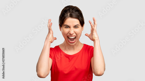 Furious woman portrait. Feeling madness. Angry screaming lady isolated on neutral copy space. Overwhelmed hate. Agonize and frustration. Negative emotion