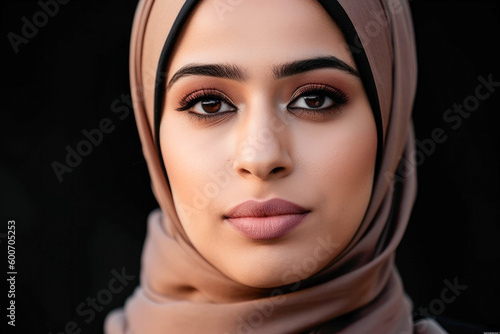 Generative AI illustration of a Crop portrait of young Muslim female in hijab looking at camera with blank expression