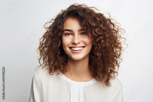 Generative AI photo of positive joyful lovely girl with bright toothy smile wavy hair good mood isolated on white background
