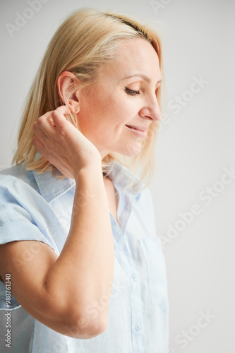 Gentle woman smiling and looking down. Close up portrait of pretty woman in blue shirt on light background.