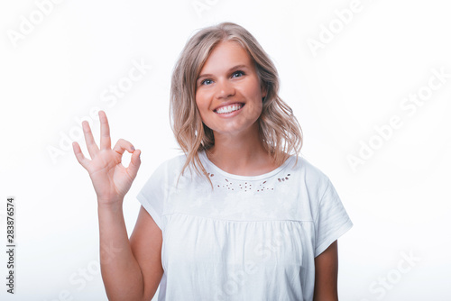 Gesture concept. Photo of young woman, doing ok gesture at camera aand standing over white background