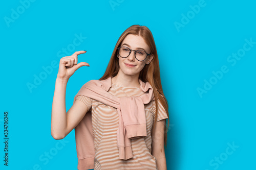 Ginger caucasian lady with freckles and glasses is gesturing the small sign with fingers posing on a blue wall