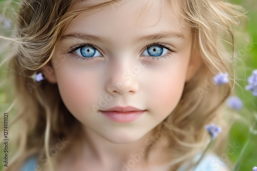 Girl, blue eyes, field, flowers, portrait