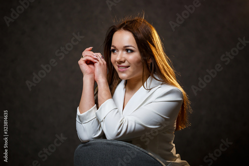 girl businesswoman in a white jacket with beautiful hair and a smile