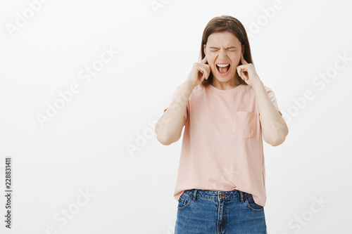 Girl cannot stand when parents fight, closing ears with index fingers, closing eyes and shouting, being under pressure, feeling stress and unhappy, standing depressed and fed up over grey wall