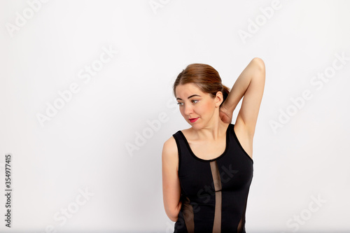 girl doing sports stretching on a white background, hands in the lock, space for text