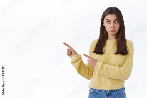 Girl express regret missing good opportunity, gloomy pouting, looking and pointing fingers left with jealous upset or disappointed emotions on face, standing white background sulking