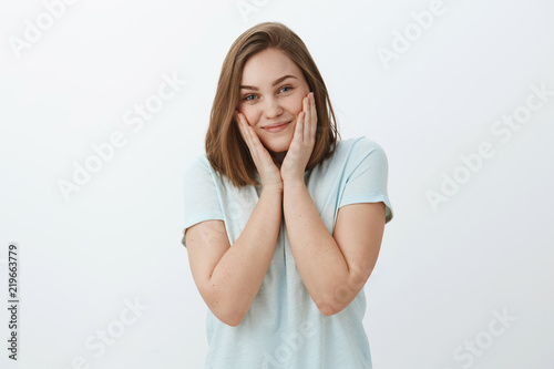 Girl finally get rid of acne with new facial mask. Charming pleased and bright woman touching cheeks and smiling joyfully feeling beautiful and fresh solving skin problems posing against grey wall
