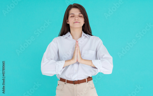 Girl greets you buddhist way. Smiling attractive charming caucasian woman holding palms together pray, smiling friendly showing namaste welcome gesture, inviting asian guests come in