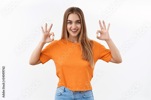 Girl guarantees best quality. Portrait of assertive good-looking blonde female assure all okay, show ok signs and smiling, confirm and recommend product, rate excellent item, white background