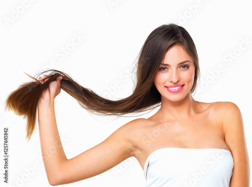 Girl, hair care and pull with smile in studio for beauty, treatment and pride by white background. Woman, model and happy with hairstyle, strong and growth with cosmetics for transformation in Spain