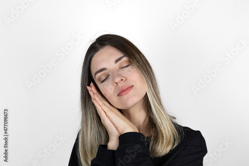 Girl hands cheek sleep gesture. Good night and have nice dreams. Peaceful photo white background isolated. Wish sweet dreams. Lullaby concept. Go to bed. Healthy lifestyle. Time to sleep. Eyes closed.