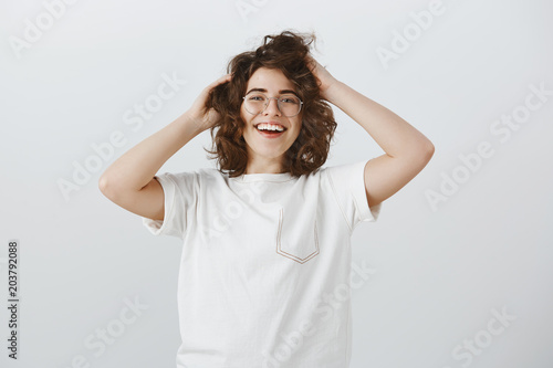 Girl having great day in park with friends. Positive good-looking creative female in trendy eyewear, holding hands on curly hair and smiling broadly, feeling carefree and joyful over gray wall