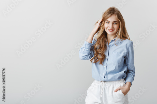 Girl having ordinary chit-chat with friends. Studio shot of charming young caucasian female blonde in blue blouse, touching hair and smiling cheerfully, being polite with client during work in office