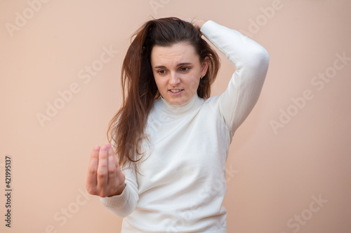 girl holds a piece of hair in her hand. Brittle hair.